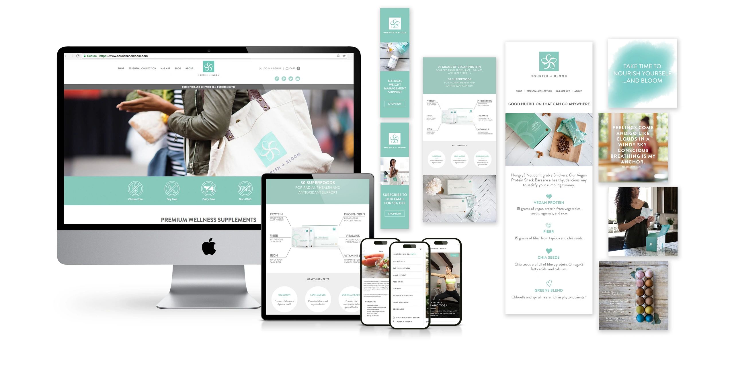 I played a pivotal role in building and promoting Nourish + Bloom from scratch. My responsibilities encompassed all aspects of design and creative direction, including brand guidelines, packaging, digital assets, web and app design (with a focus on UX/UI), landing pages, social media content, and email campaigns. Additionally, I handled product and lifestyle photography and contributed to directing our fitness and educational video shoots.